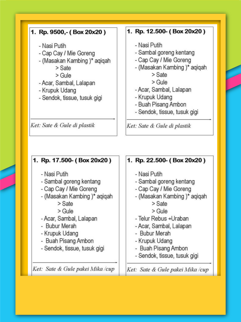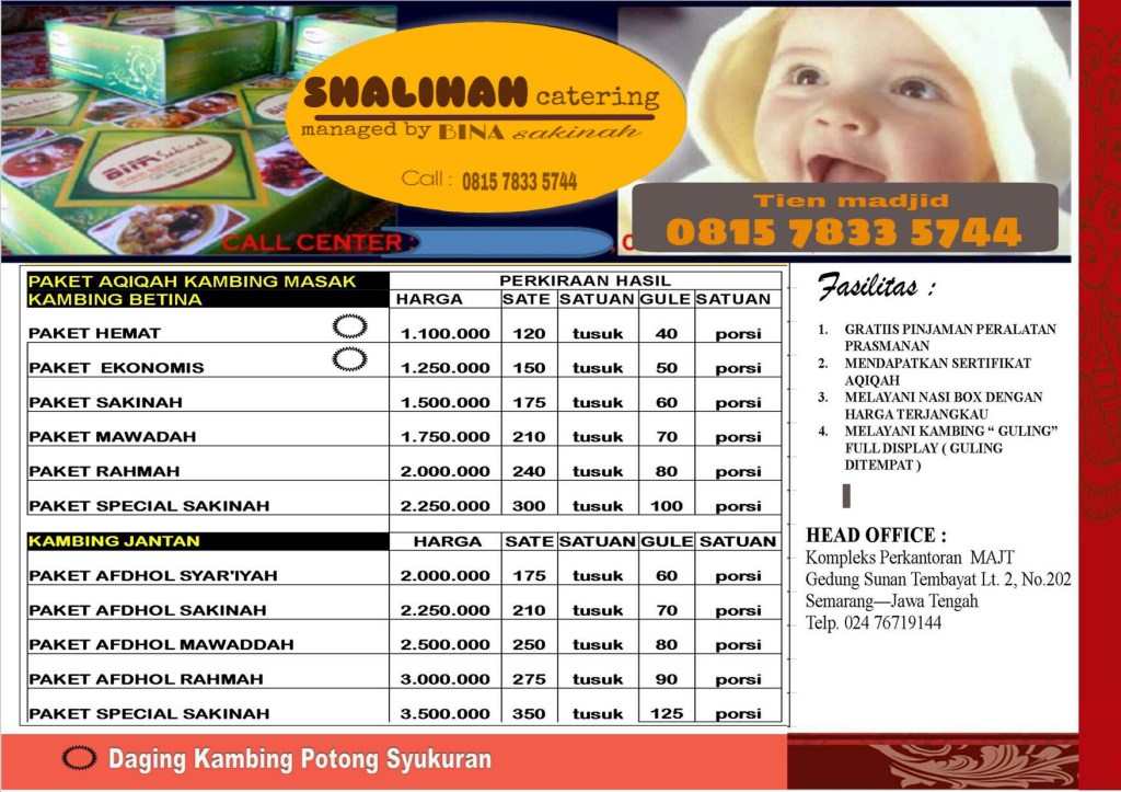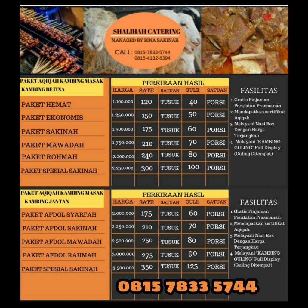 PAKET KAMBING AQIQAH PAKET KAMBING AQIQAH SHALIHAH CATERING MANAGED BY BINA SAKINAH 0815-7833-5744 085941328394 Daftar menu dan harga Paket Aqiqah. dan harga paket kambing Aqiqah. Paket menu pendamping Aqiqah. Box dengan tampilan yang elegan dari Shalihah catering. Share this: Click to share on X (Opens in new window) X Click to share on Facebook (Opens in new window) Facebook Like Loading...