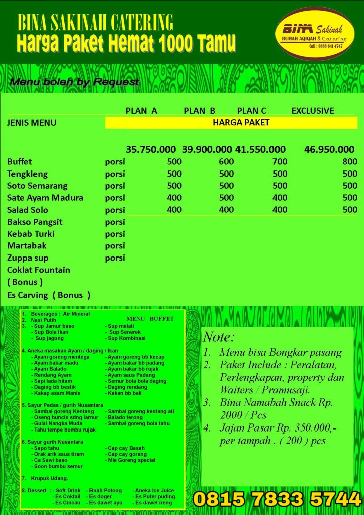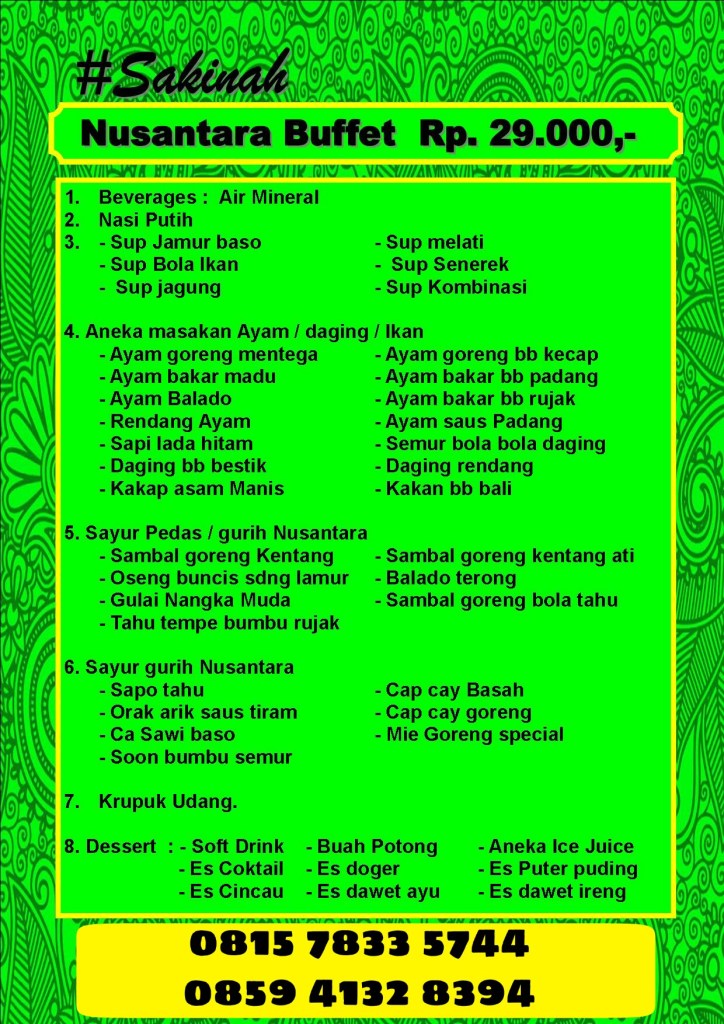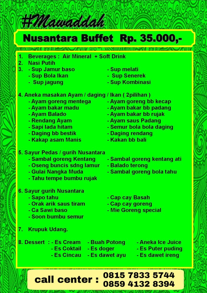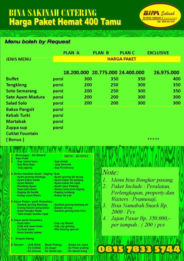 PAKET PERNIKAHAN PAKET PERNIKAHAN SHALIHAH CATERING MANAGED BY BINA SAKINAH 0815-7833-5744 / 0859-4132-8394 Daftar Harga paket hemat 400 tamu. Daftar harga paket Hemat 600 tamu Daftar harga menu hemat 1000 tamu Nusantara Sakinah. Paket Buffet Nusantara Mawadah. Menu Paket Buffet Nusantara, Rahmah. Share this: Click to share on X (Opens in new window) X Click to share on Facebook (Opens in new window) Facebook Like Loading...